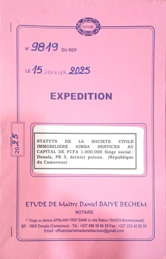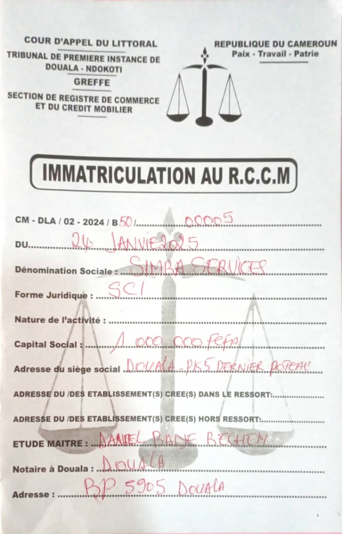 Simba Service is officially registered as a legal entity under Cameroonian law.
